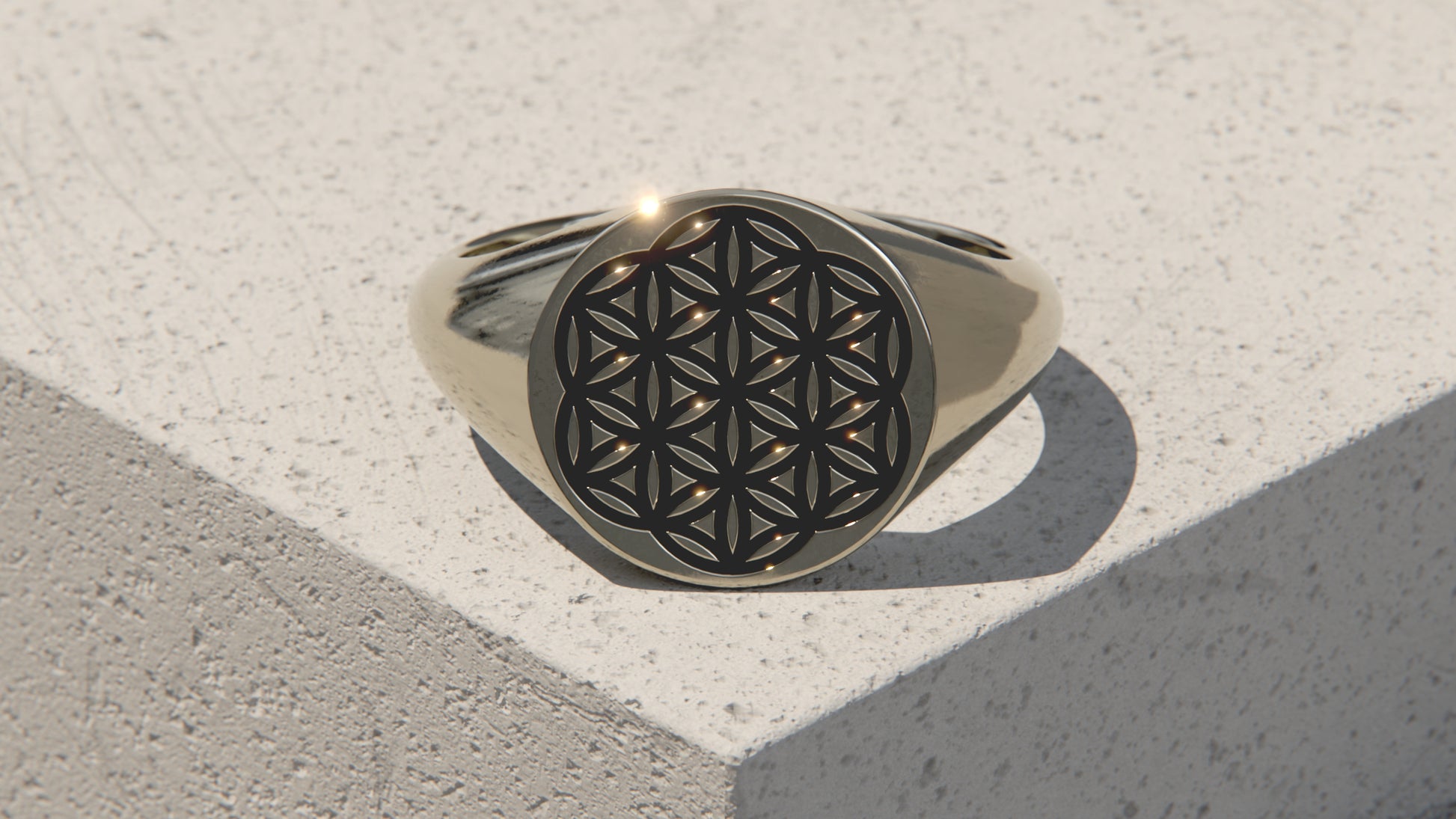 Anillo Sello Flor de la Vida - Oro blanco de 9 quilates