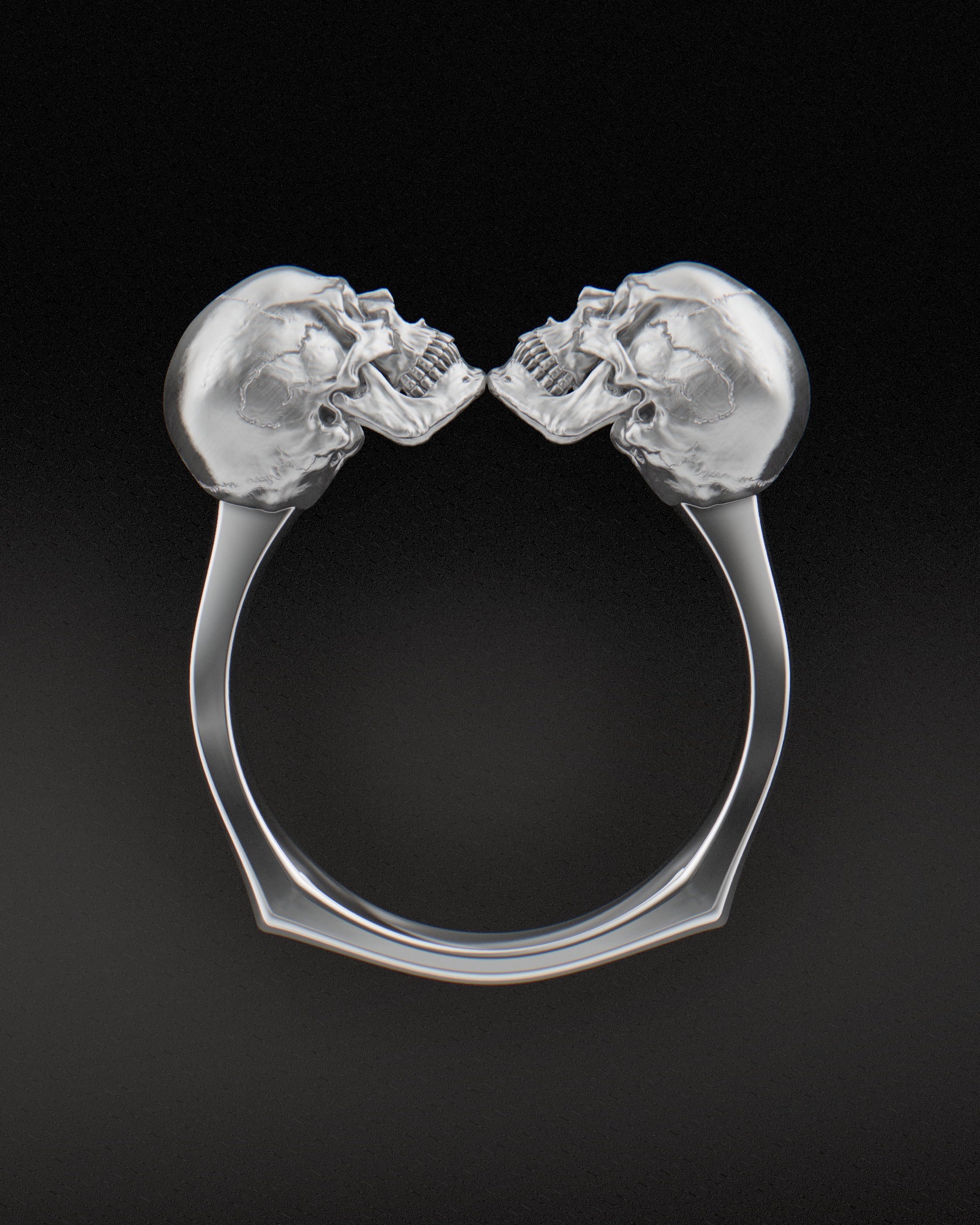Discover our Sterling Silver Eternal Lovers Ring, a meaningful symbol of enduring love. Crafted from high-quality solid sterling silver, this unique ring features a polished silver shank and two contrasting matte finished skulls, representing the unbreakable bond between two hearts, both in life and beyond.